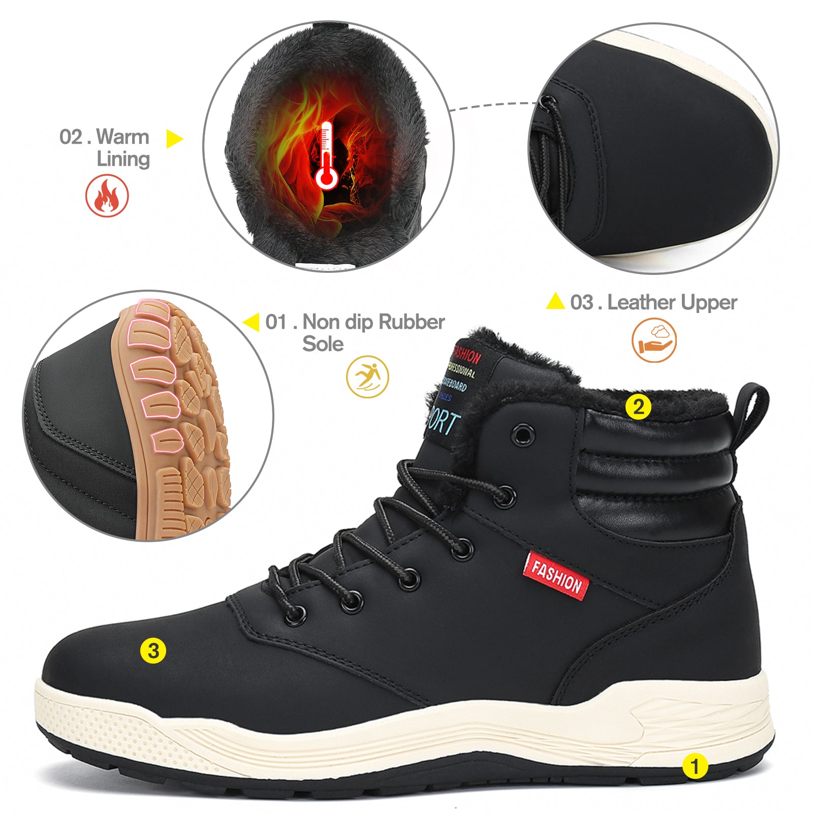 Premium Leather Upper – PU leather repels snow and water, keeping feet dry all day.
